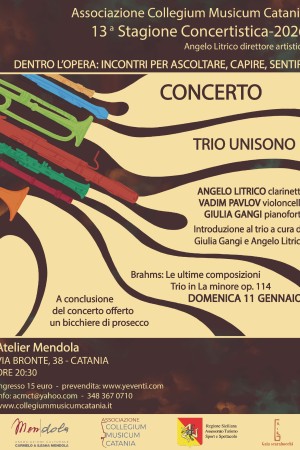 Concerto con il Trio UNISONO che eseguirà di Brahms il trio in La minore op. 114, con una introduzione curata da Giulia Gangi e Angelo Litrico